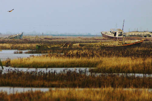 Port du Pavé à l'embouchure de la Sèvre Niortaise, fin de journée d'hiver. Cet endroit ressemble à un cimetière à bateaux où il règne une ambiance étrange. Quelques embarcations laissées à l'abandon sont survolées par rapaces et goélands, comme ci le bois les attirait et qu'ils pouvaient trouver de quoi se nourrir ici...